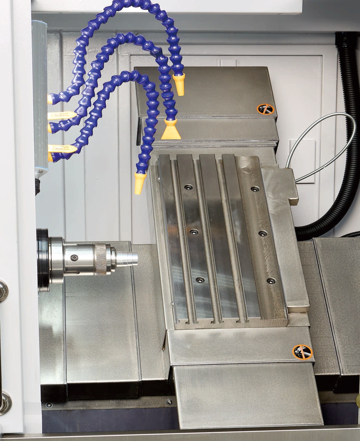 Допълнителното приспособление включва купола, глава за мухъл и захранваща глава. Захранващата глава може да се върти, позволявайки произволни ъгли на завъртане от 0° до 90°, което позволява интегрирано фрезоване и струговане.